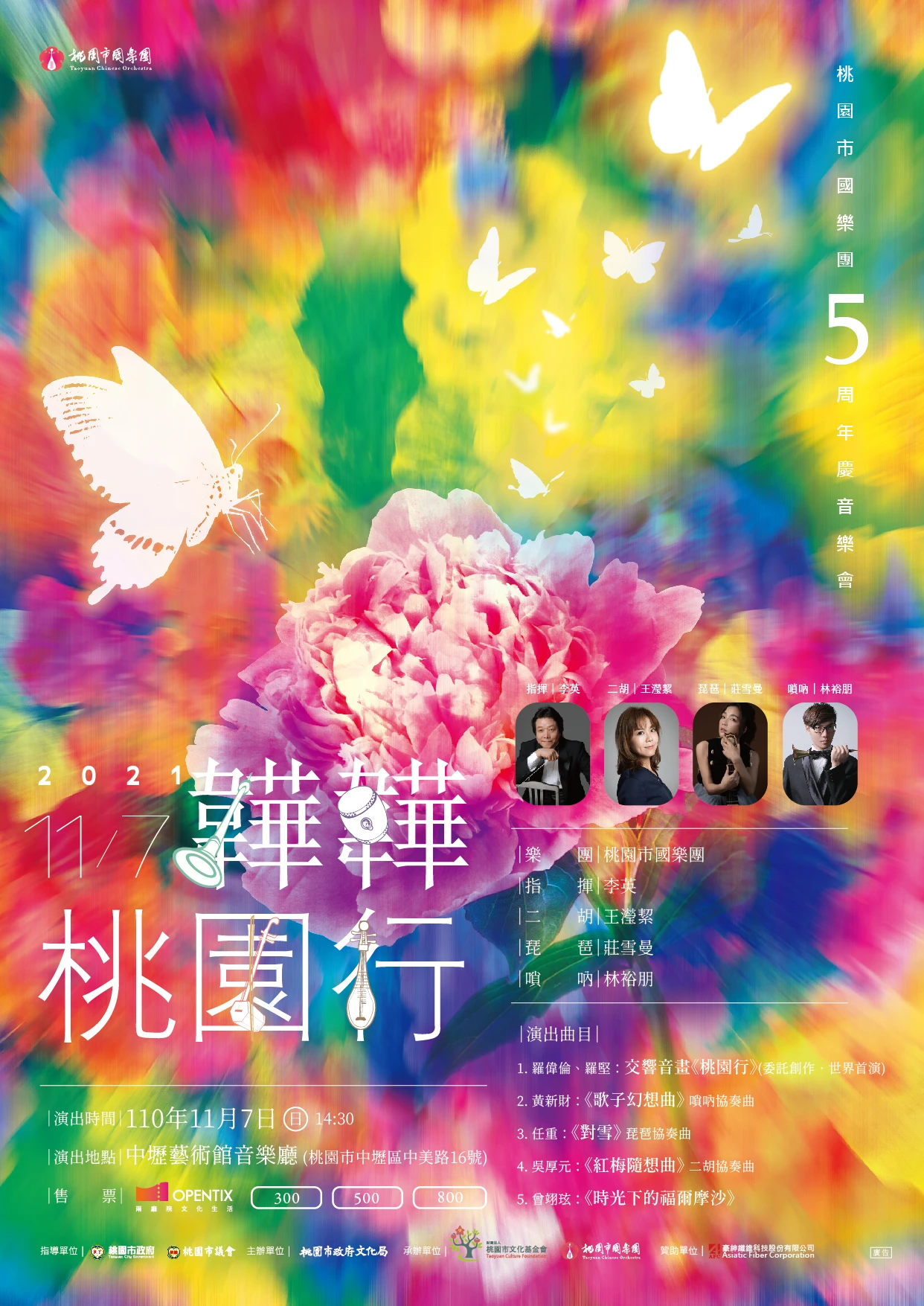 如此豐盛的節目內容,除了慶祝桃園市國樂團五周年慶,亦開啟台灣這滿載熱情的音樂能量!誠摯邀請您於11月7日下午2:30中壢藝術館音樂廳共賞優美樂音!