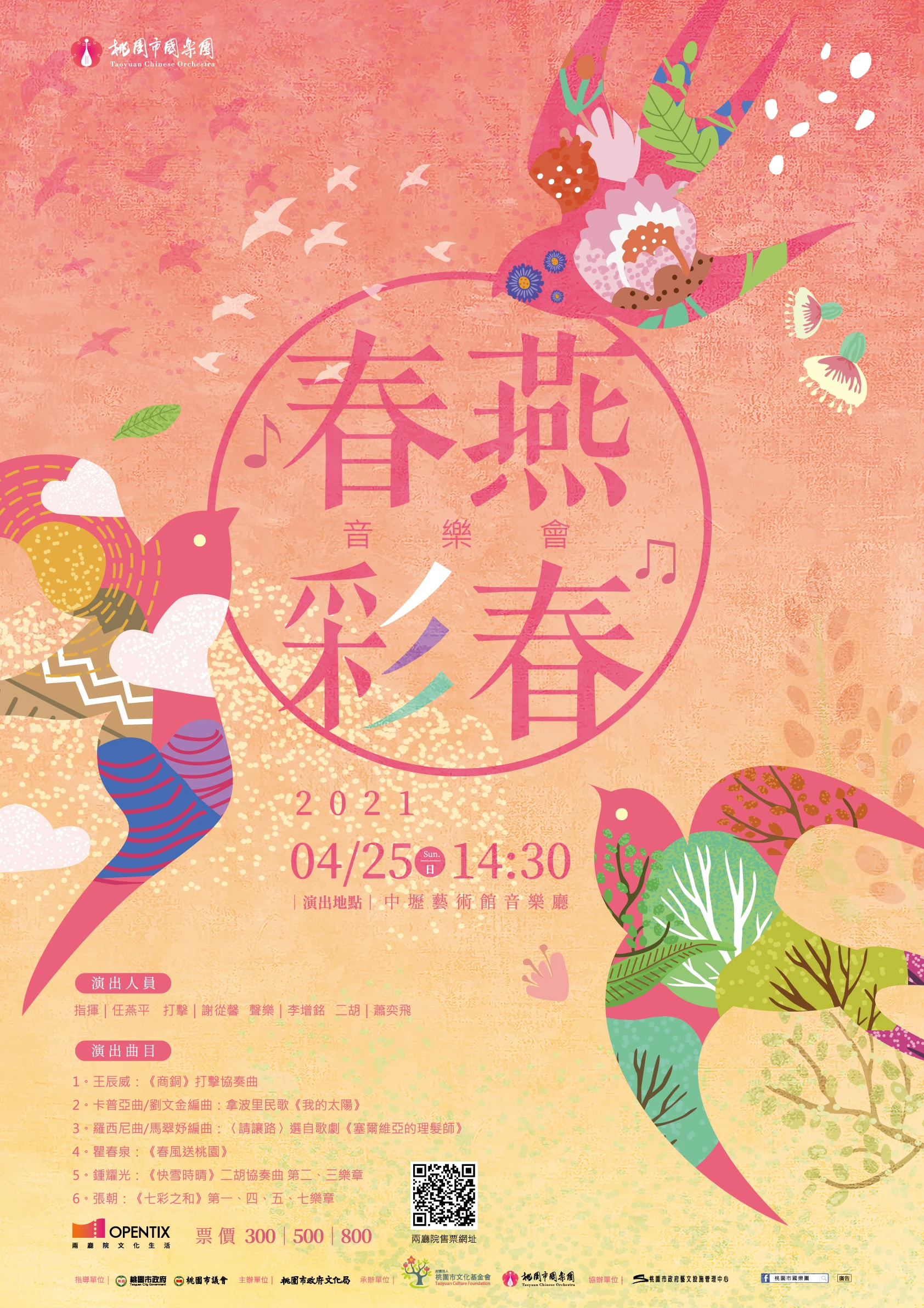 《春燕彩春》音樂會 由指揮任燕平領銜,邀請台北市立國樂團打擊首席謝從馨、台北愛樂合唱團男中音李增銘以及桃園市國樂團二胡演奏家蕭奕飛,共同攜手打造中西融合的多樣曲風,多首經典作品,猶如開啟美好的願景,迎來燕舞艷陽天!