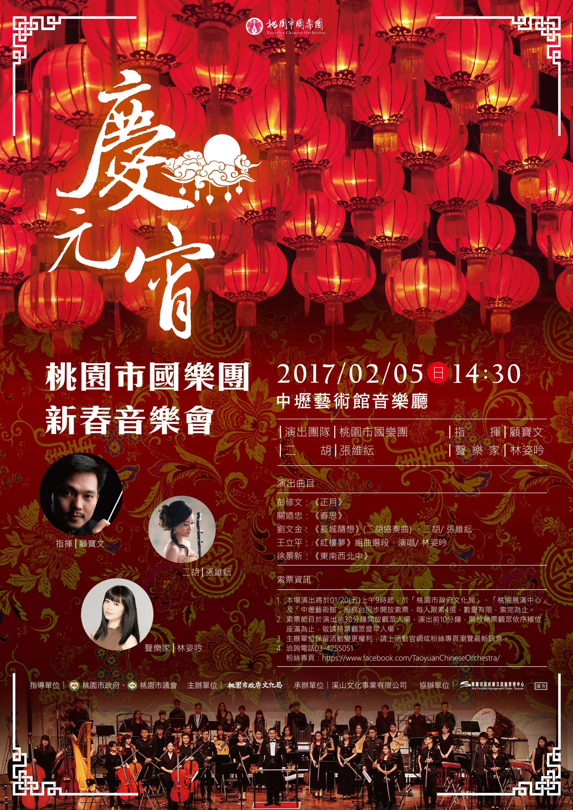 桃園市國樂團2017新春音樂會在中壢藝術館音樂廳熱鬧慶元宵,由榮獲傳藝金曲獎「最佳專輯製作人獎」的顧寶文擔任指揮,以及二胡演奏家張維紜、跨界聲樂家林姿吟擔綱演出,吸引許多樂迷們一同共享盛舉!